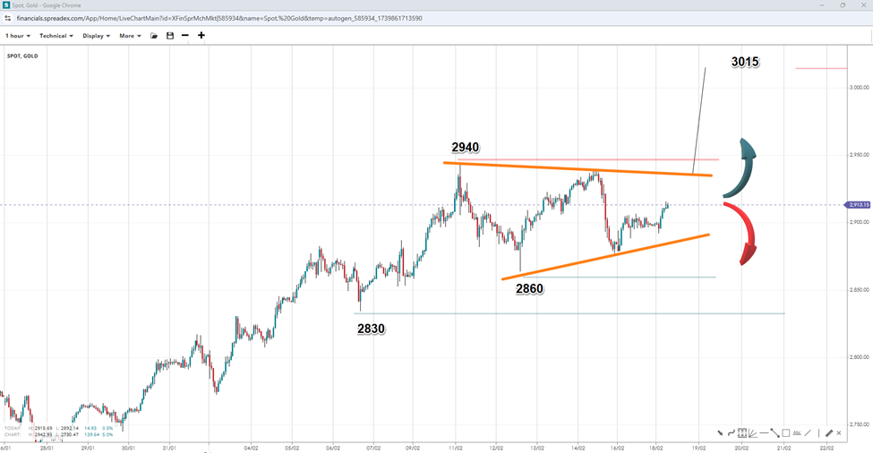 A pennant pattern may have formed in gold, which could push prices to $3015 per ounce if a breakout above the peak of $2940 occurs. However, if bullish momentum wanes, the pattern could evolve into a triangle, extending the period of consolidation between the peak and $2860.  Below the local support, a breakdown of $2830 could expose lower levels and potentially lead to a deeper correction, likely turning the pattern into a flag pattern.