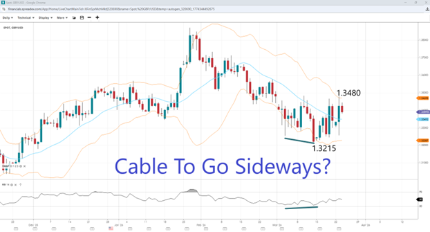 - Cable under pressure as markets price in up to two rate hikes this year if conditions in the Middle East persist.