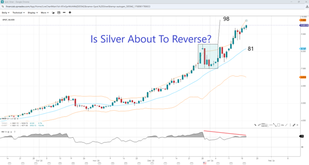Silver has been trading on the upper side of VWAP since November last year, keeping the uptrend intact with major support at $81.67. Judging by its latest correction from $84 to $70, the measured move projection suggests a target of $98, shy of the $100 mark. Consequently, this is at the same level as the current VWAP resistance. But despite its impressive rally, the VWAP has also begun to expand, while the RSI remains in divergence, pointing to increased volatility and a potential pullback.