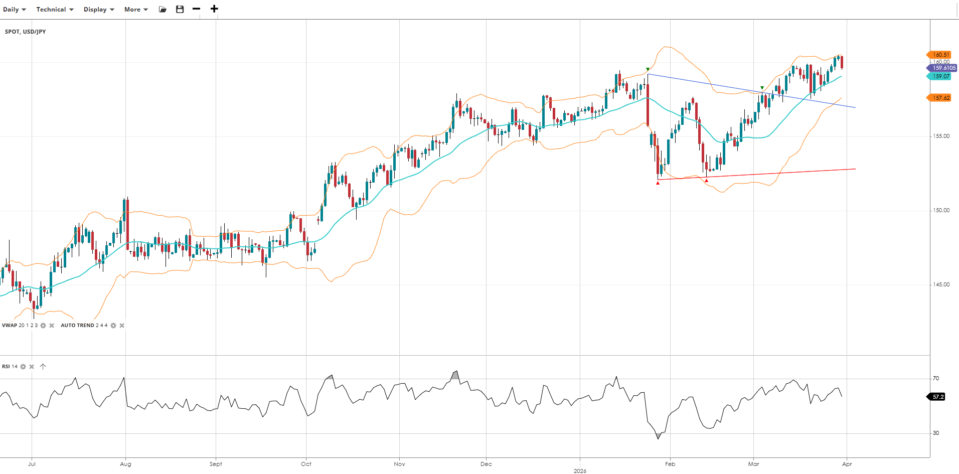 USD/JPY continues to trade near its highs but volatility has compressed around 160 and it is only just above the VWAP. The RSI remains comfortably above the midpoint, suggesting healthy momentum. A decisive break and hold above 160 would be a significant technical development, while a fakeout would open a return to 2026 lows.