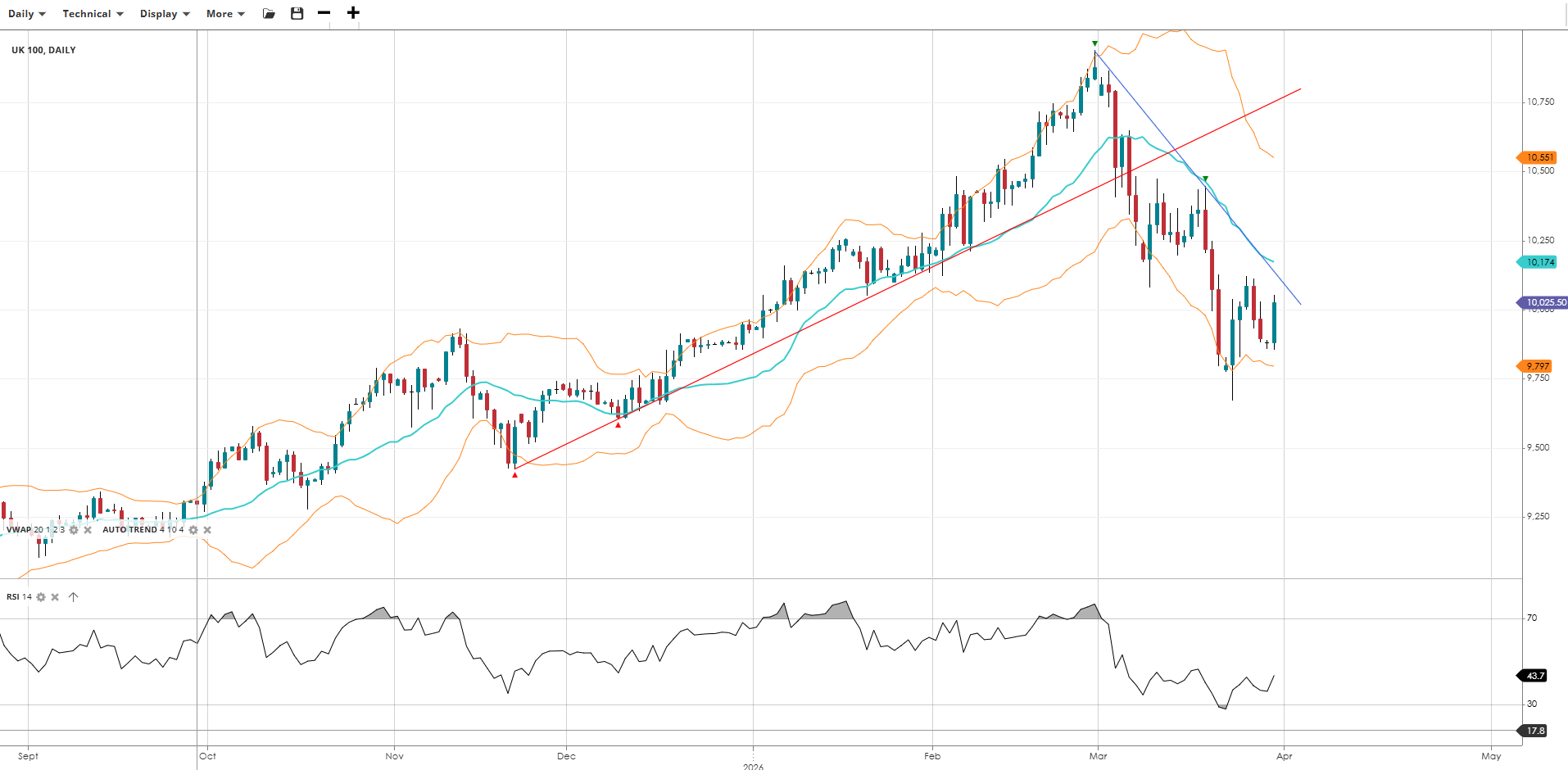 The UK 100 has pulled back sharply from its all-time highs and is trading below the VWAP, though it is showing tentative signs of stabilisation after the recent steep decline. The RSI has recovered from its most oversold levels and is now in moderate territory, suggesting selling pressure may be easing. The index remains in an impulsive phase until a sustained move back above the VWAP.