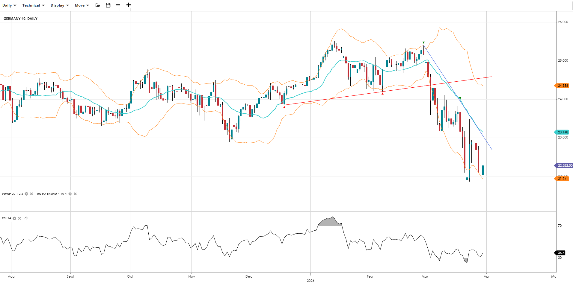 The Germany 40 continues to trade well below the VWAP as bearish momentum persists following the sharp sell-off of recent weeks. The RSI remains depressed but has recovered from its most extreme readings. The index remains in an impulsive mode, with the VWAP and downtrend line acting as the first meaningful resistance overhead.
