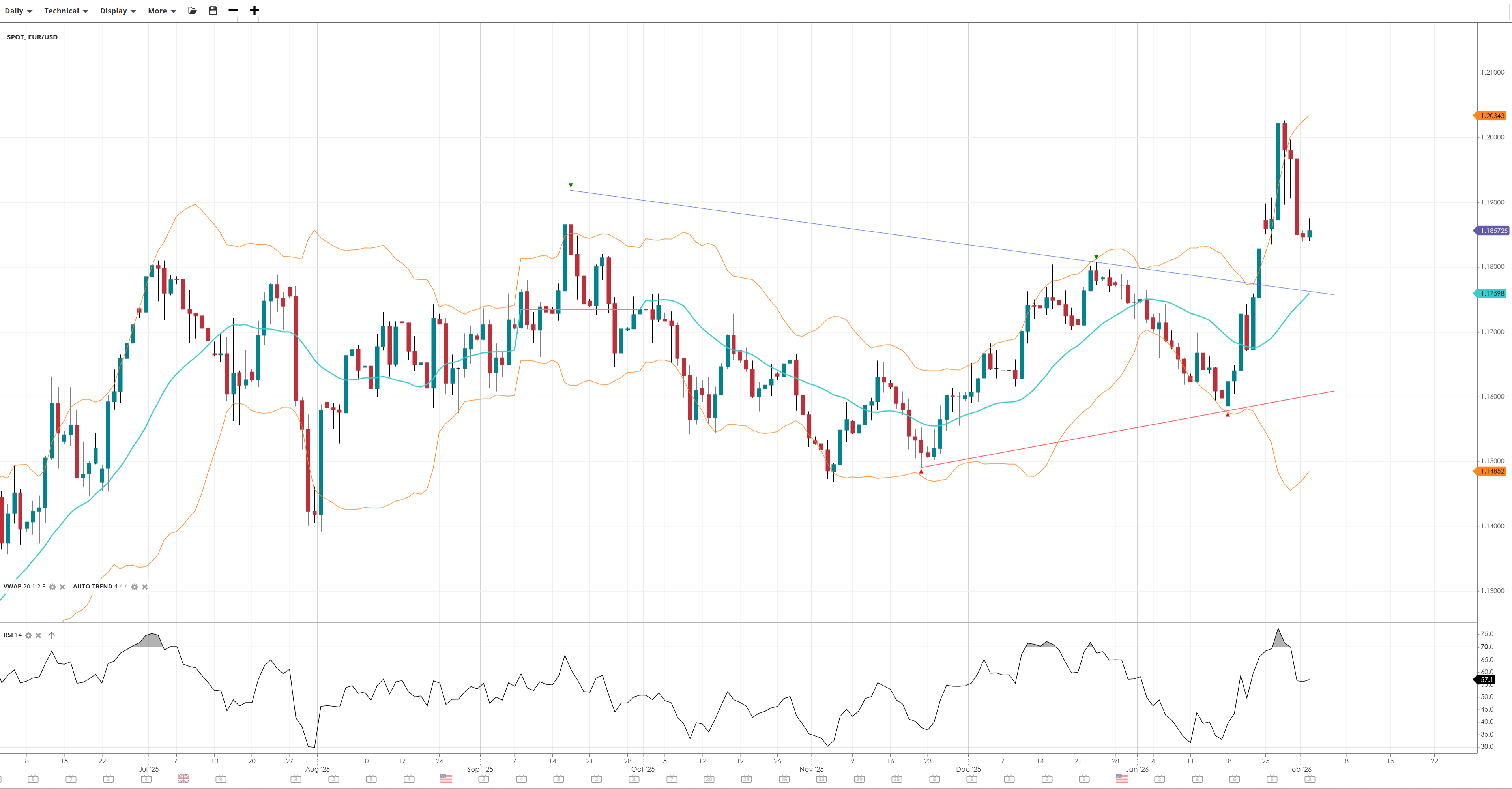 EUR/USD has pulled back from its move to a 4-year high, still trading comfortably above the VWAP and testing support at 1.185. Momentum has dropped off but still bullish with RSI over 50.