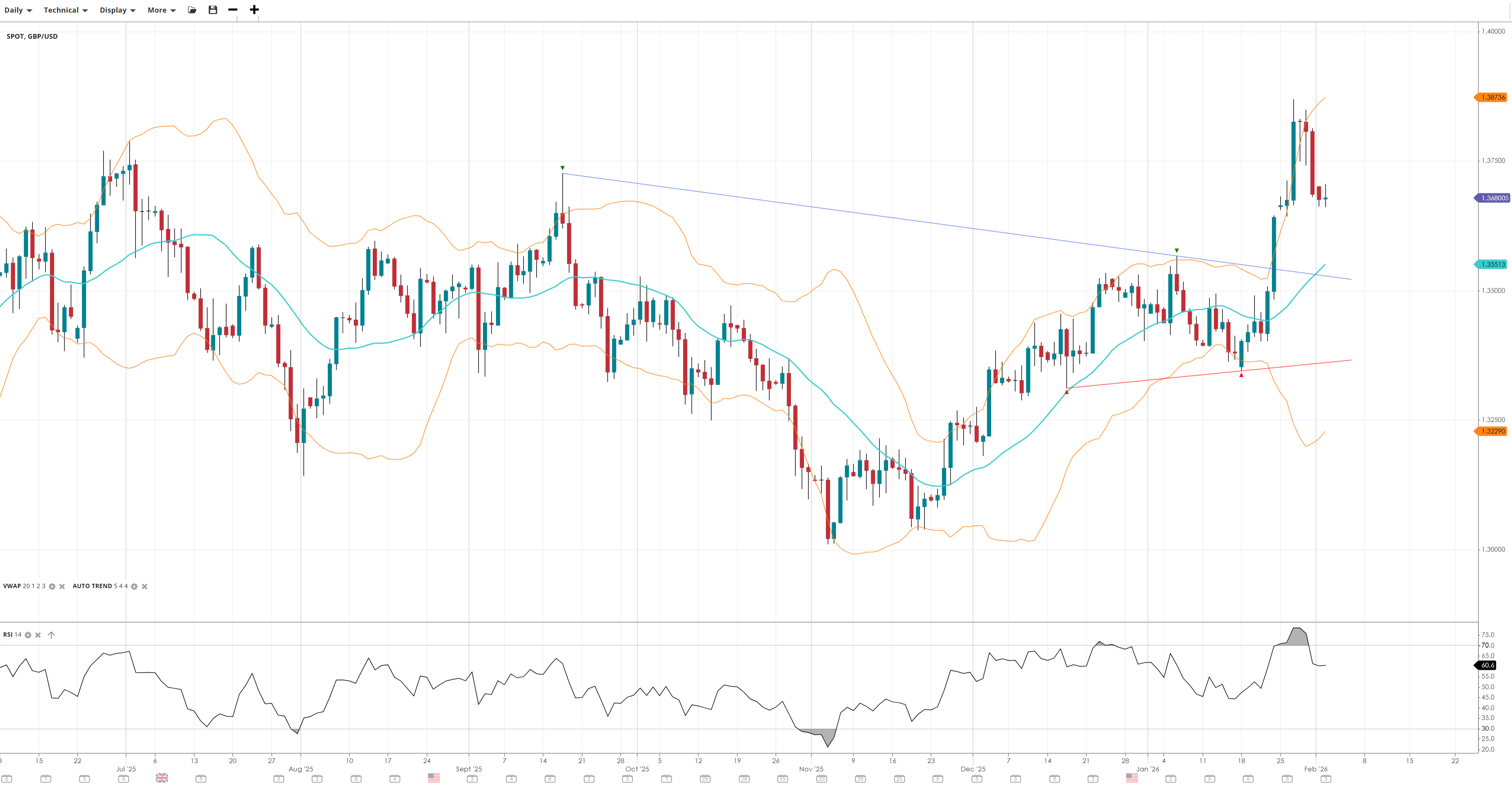 GBP/USD has pulled back from its bullish impulse, leaving the price still above the VWAP but below range resistance around 1.37-375. There is strong momentum with RSI out of overbought territory. Buyers are in control while the breakout holds.