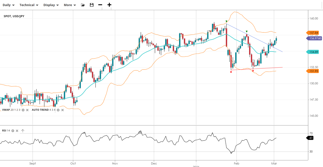 USD/JPY is positioned in the upper portion of its current sideways range. While the broader trend is neutral, short-term momentum is positive, with the price holding above the VWAP and trending toward the upper resistance ceiling.