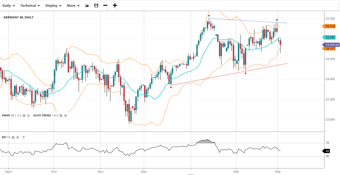 Germany 40 is currently range-bound, oscillating within a sideways trend. Price action is trading slightly below the VWAP, reflecting neutral momentum as the index continues to consolidate between established support and resistance levels.