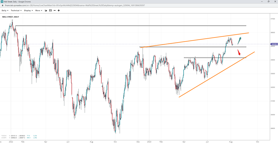 While Wall Street fell to 35k following a lack of momentum towards 36k, prices remained above the 34920 support, keeping upside speculation open. Above the round hurdle lies the 36500 resistance, whereas expected support at 34180 may reveal a wedge pattern.