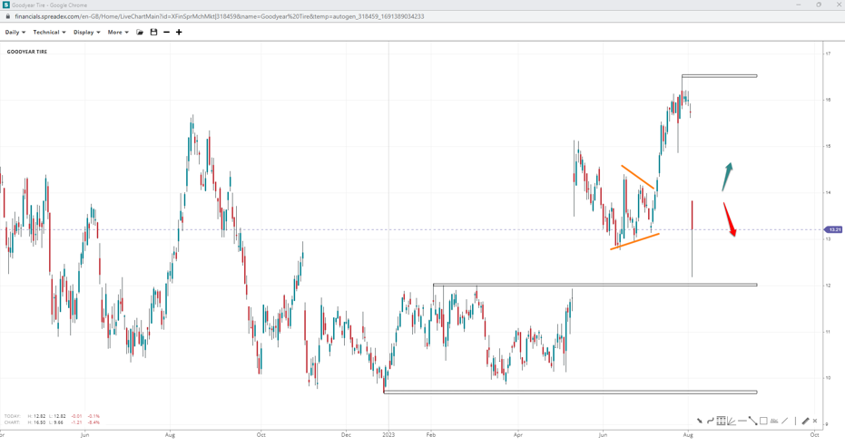 The stock price of Goodyear completed a pennant down at $13, but the succeeding raise didn’t manage the keep price action bullish, as prices fell below the pennant low. However, if $12 holds firm, a move towards the peak at $16.50 may be seen. Otherwise, penetration of the pre-pennant range could see increased downward price action, opening the door to $9.70.