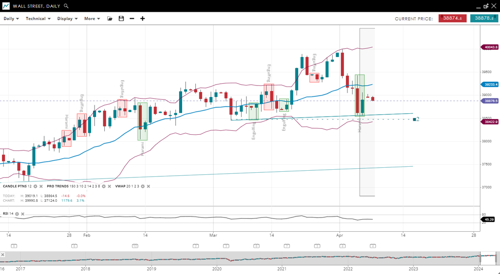 Wall Street remains in a bullish trend but has entered a corrective phase, with a notable decrease in price to 38,876, now below the upward-sloping 20-period VWAP of 39,233. The index's support is adjusted to 38,422, with resistance determined at 40,043. The RSI has decreased to 45, flipping from bullish to bearish momentum.