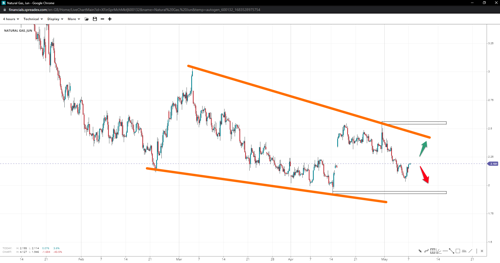Natural gas prices dropped to 2.00 last week, resembling a terminal wedge pattern should one more leg down under 1.95  is seen. If buyers can successfully send prices back above 2.55, it could invalidate the pattern. However, a decent attempt at 2.25 will be required first, anyway. Otherwise, prices may head toward 1.90.