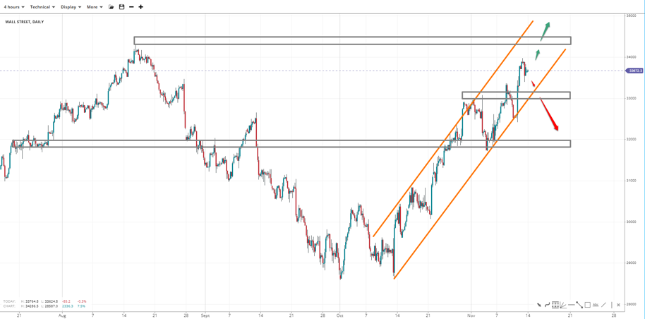Wall Street continues with its accelerating upward trend as prices trade within a bullish channel. 34300 is significant resistance before attempting the upper trendline above the 35k handle, where an initial rejection is expected. 33k is critical short-term support, the break of which might halt the uptrend and cause a retracement down to the 32k handle.