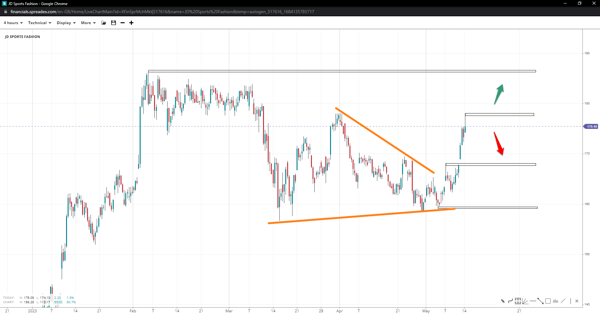 JD might have just finished a triangle pattern down at $160, paving the way to $186 and beyond following the successful break past $178. However, the chances of the triangle being incomplete remain high, especially if the short-term resistance is not reached. Consequently, if bulls lose $168 during a potential battle, we might see a slide toward $156.