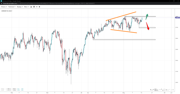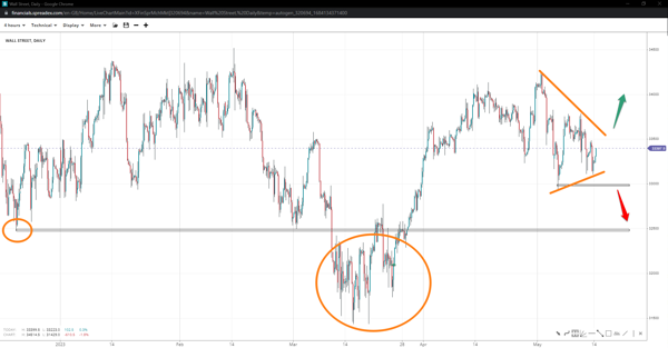 Wall Street might have put a pennant in at the 33100 support unless prices fall under 32930. In that event, the right shoulder of a potential H&S may form down at 32500. Otherwise, a move past 33780 will bring 34k and the high of 34100 back on the bulls’ radar.