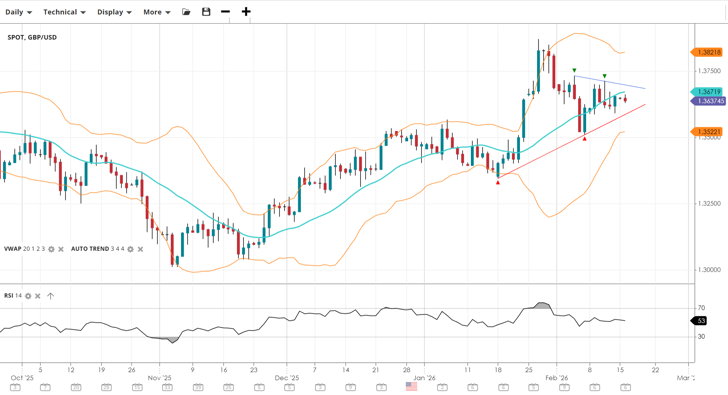 GBP/USD has dipped slightly below the 20-day VWAP (1.3672) as it undergoes a shallow pullback. Despite this, the RSI remains above 50, and the long-term trend remains bullish. Support at 1.3522 remains the key floor for bulls to defend to keep the uptrend intact.