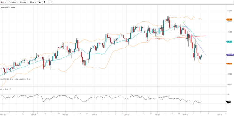 Wall Street remains in a bearish correction phase, trading significantly below its VWAP with no clear sign of stabilisation. RSI has recovered slightly from deeply oversold levels but remains weak, and price continues to hover near the lower boundary of its volatility bands, suggesting the path of least resistance is still lower.
