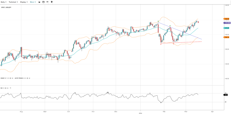USD/JPY continues in its bullish trend and is in a pullback phase, with price holding above the VWAP after a brief dip lower. RSI is strengthening in the low 60s, and price is pushing toward the upper resistance band, suggesting the broader uptrend remains intact and a test of 160 is plausible in the near term.
