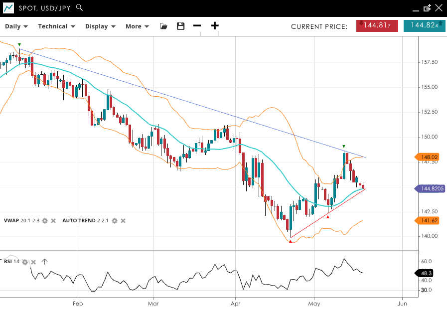 USD/JPY is bearish and correcting, with price at 144.82 and VWAP nearly matching at 144.80. RSI at 48.3 suggests neutral momentum. Support is down at 141.62, and resistance is higher at 148.02.