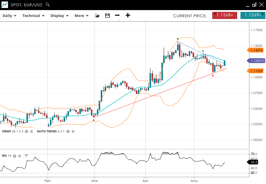 EUR/USD is trending bullish and is in a correction phase. Price is at 1.1269, nearly equal to its VWAP of 1.1270 after a lift off the lows. RSI at 53.5 hints at a potential short-term bounce. Support sits at 1.1107, and resistance is at 1.1476.