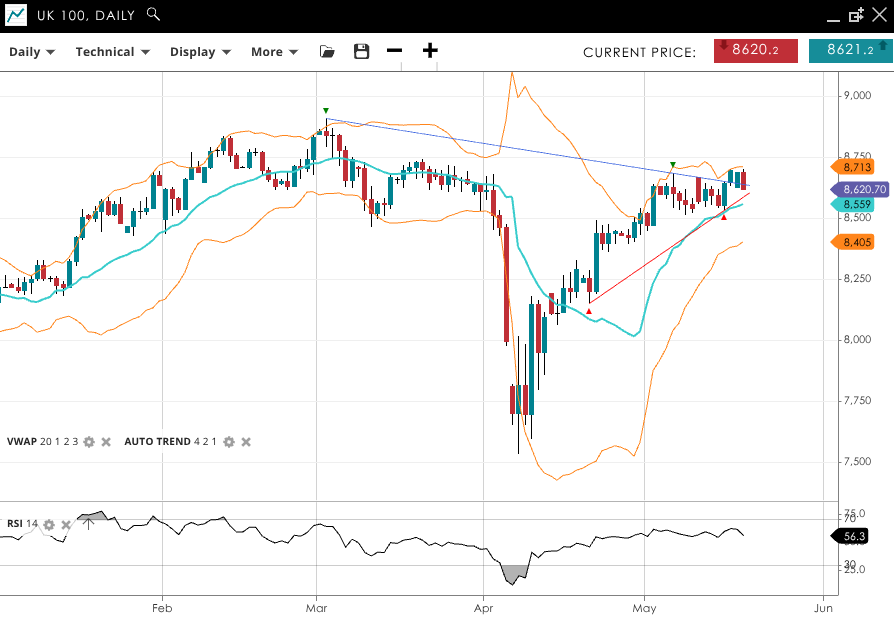 The UK 100 remains in a bullish trend but is currently in a correction phase. Price is 8,621, just above the VWAP at 8,559, showing mild strength. The RSI of 56.3 indicates steady momentum. Support lies at 8,405, and resistance at 8,713.