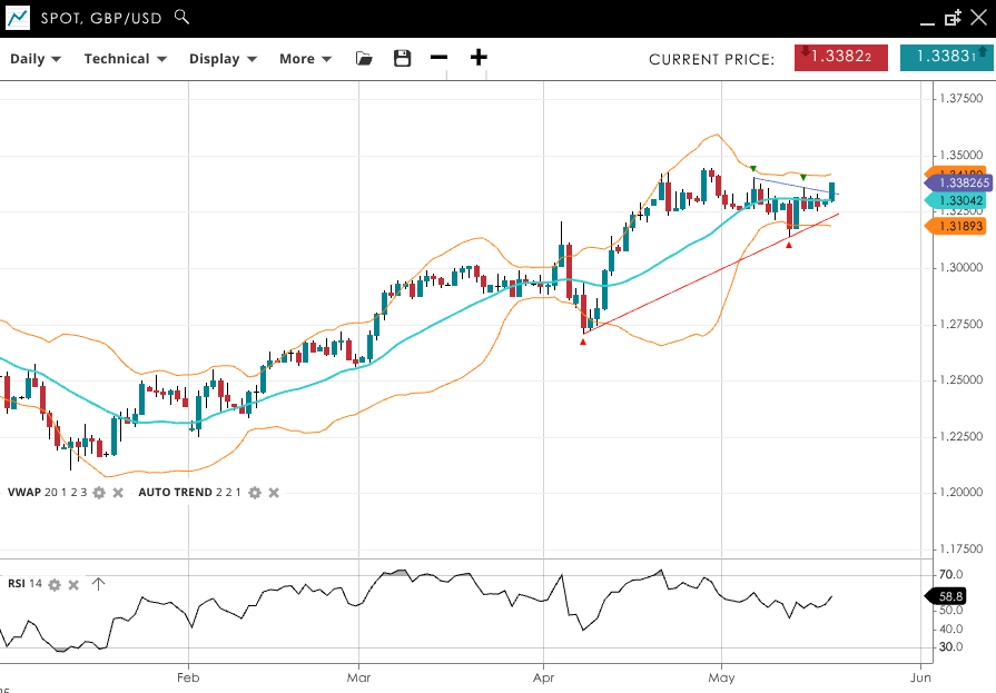 GBP/USD is in a correction but back near its recent highs after a move higher within its bullish trend. It trades at 1.3383, above the VWAP of 1.3304. The RSI of 58.8 indicates strengthening buying momentum. Support is at 1.3189, and resistance is at 1.3410.