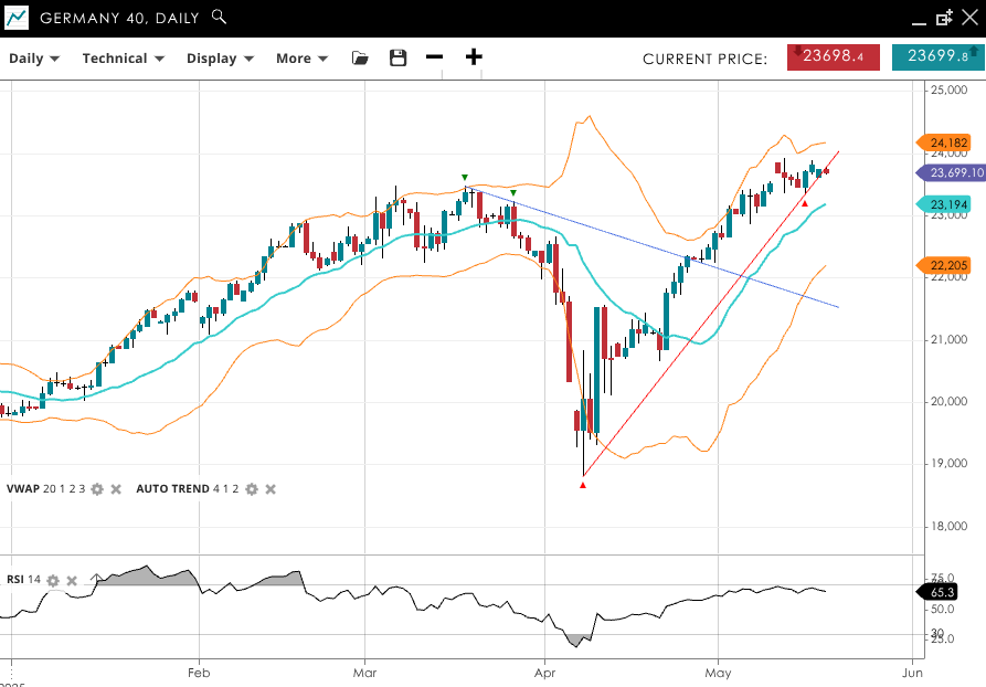 Germany 40 is trending bullish and currently in an impulsive phase testing record highs, trading at 23,699, above its VWAP of 23,194, indicating strong upward momentum. The RSI at 65.3 suggests healthy buying interest. Support is at 22,205, with resistance at 24,182.