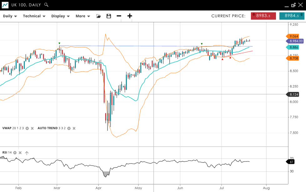 The UK 100 continues its bullish trend in an impulsive phase, trading at 8,984, above its VWAP of 8,886 but still below the key 9k level. This shows underlying strength. The RSI at 61 reflects continued buying interest. Support lies at 8,708 and resistance at 9,064.