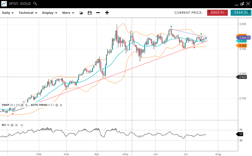 Gold is in a neutral range phase, trading at 3,364 and below the VWAP of 3,332. The RSI of 55 shows slight bullish bias. Support is at 3,283, with resistance at 3,391.