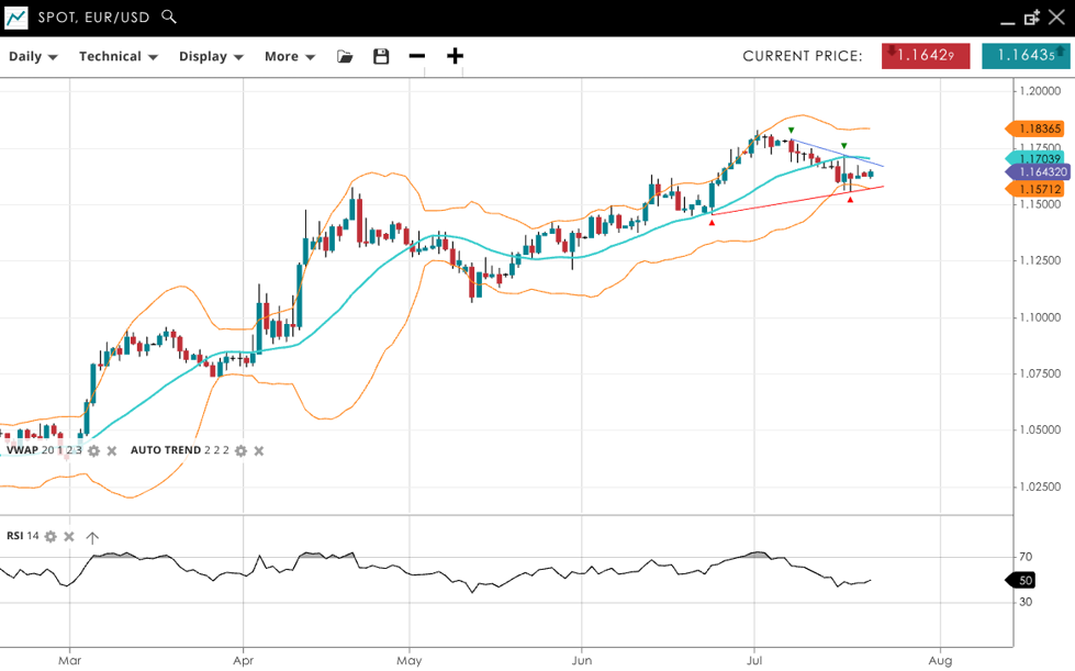 EUR/USD continues in a bullish trend but is correcting, with price at 1.1643 below its VWAP of 1.1704. The RSI at 50 implies neutral momentum. Support stands at 1.1571, and resistance is at 1.1837.