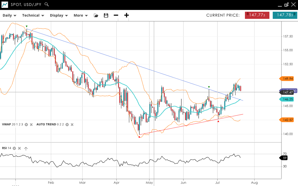 USD/JPY is in a neutral trend and ranging as it tests the upper limits of the range for a possible breakout. It trades at 147.78, above the VWAP of 146.25. The RSI at 59 suggests slightly bullish momentum. Support is at 142.57, and resistance is at 149.94.