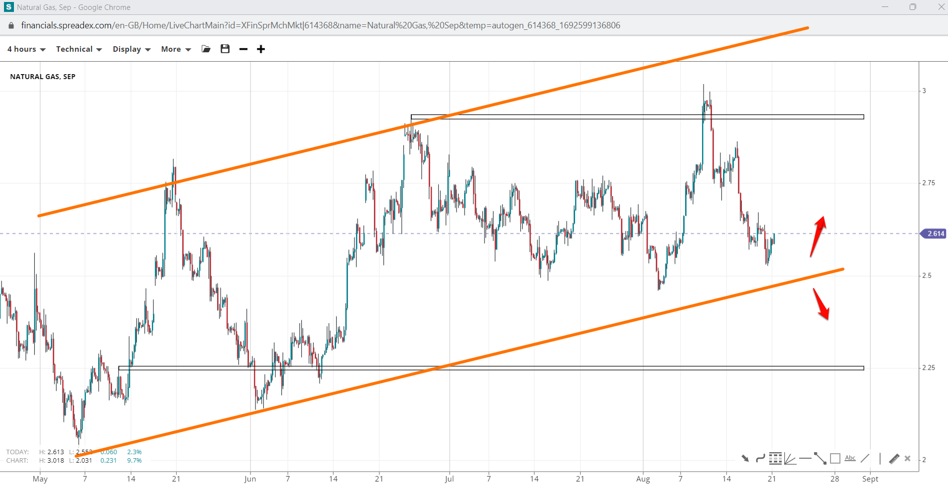 Natural gas prices remain in an ascending channel while trading above (roughly) $2.45/cf, but also largely sideways below $2.90/cf. in the shorter term. Failing to hold the bottom line could see prices decline towards $2.25/cf, whereas a bounce or upside continuation may see prices as high as $2.80/cf.