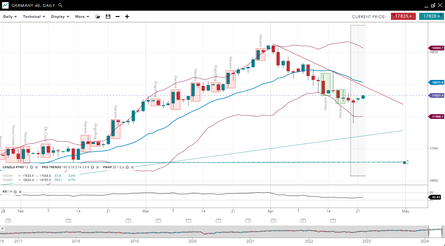 | Germany 40 | Bearish | Impulsive | 17,827 | 18,013 | 17,499 | 18,564 | 42 |
