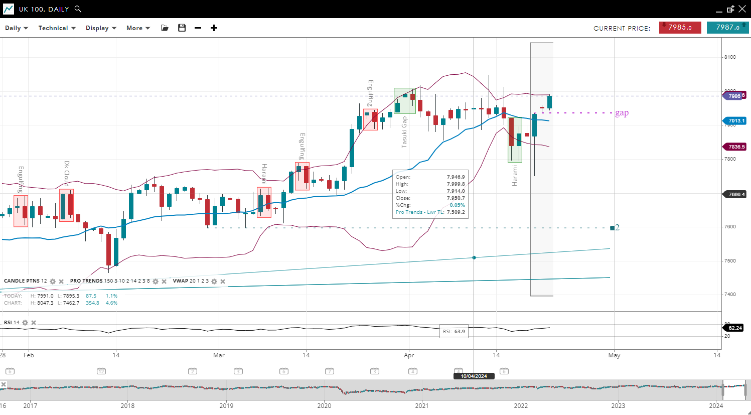 | UK 100 | Neutral | Consolidation | 7,986 | 7,913 | 7,836 | 7,986 | 62 |