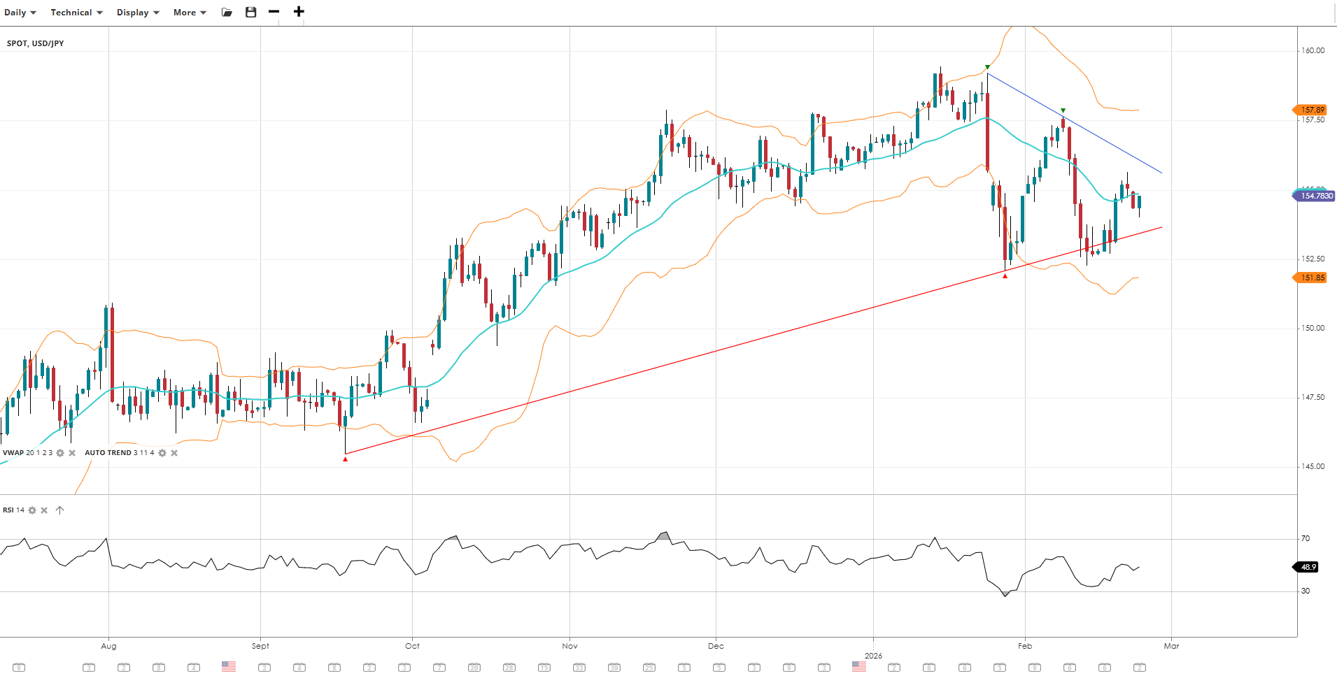 USD/JPY has stabilised and is now trading near the VWAP (154.78). The RSI has recovered to 49, suggesting the earlier bearish momentum has eased. The pair remains in a sideways range, with support at 151.85 and resistance at 157.89. A decisive break in either direction will be needed to establish a clearer trend.