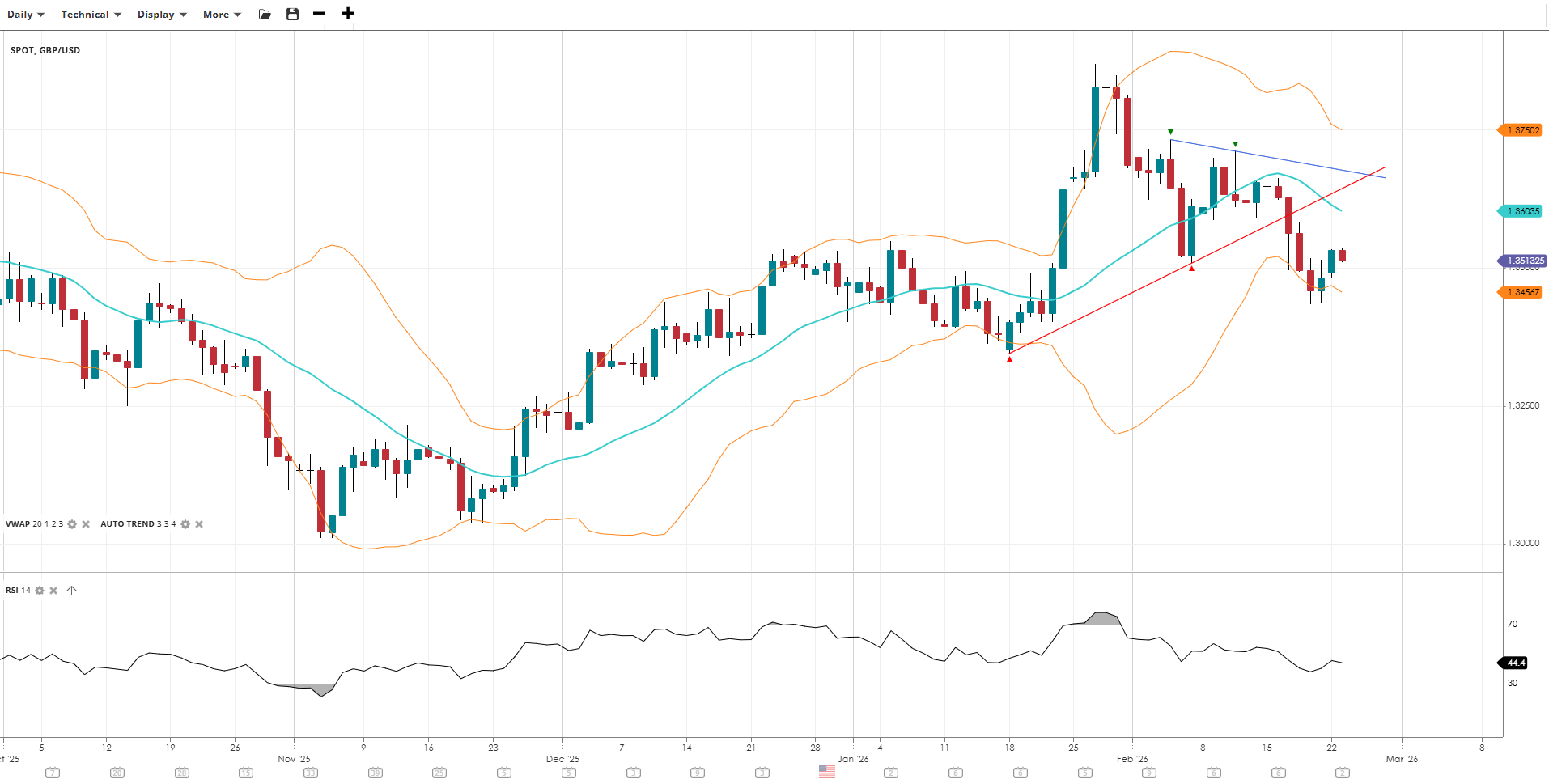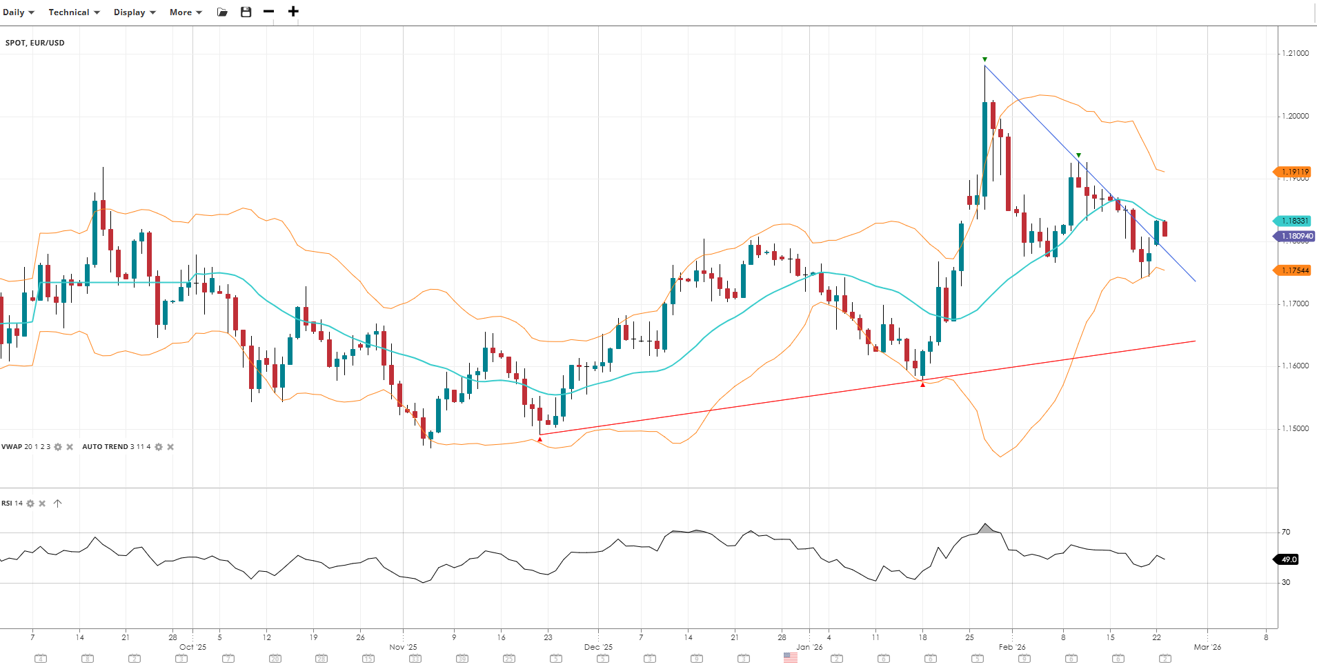 EUR/USD has failed to retake its VWAP of 1.1833, trading at 1.1809 as selling pressure has resumed. The RSI continues to tread water in neutral-to-bearish territory, suggesting the consolidation phase may be giving way to a deeper correction. The 1.1754 support level is the key floor to watch, with resistance capping upside attempts at 1.1912.
