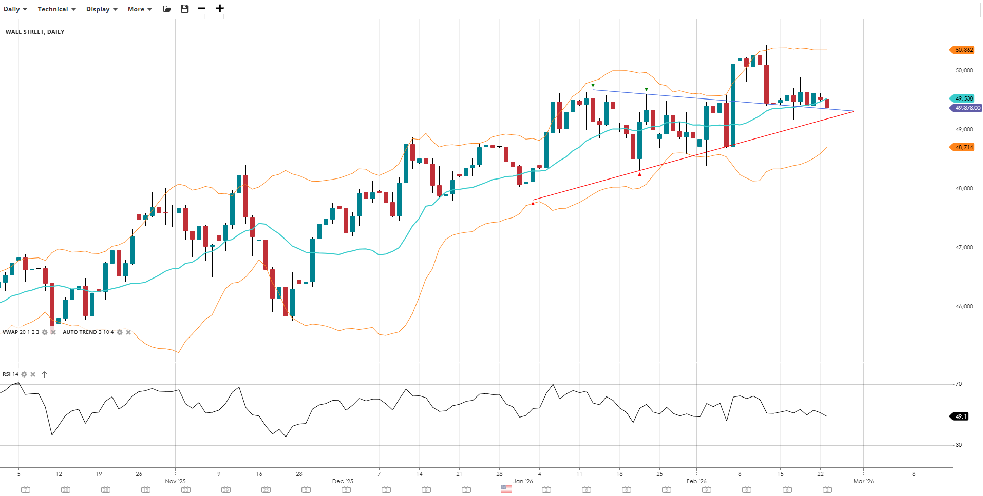 Wall Street has continued to consolidate below the 50k resistance level, with price slipping back toward the VWAP at 49,378. The RSI has eased further to 49, now sitting at neutral territory, suggesting buying momentum has faded. Bulls will need to defend the 48,714 support level to prevent a deeper pullback, while a recovery above 50,362 would be required to resume the uptrend.