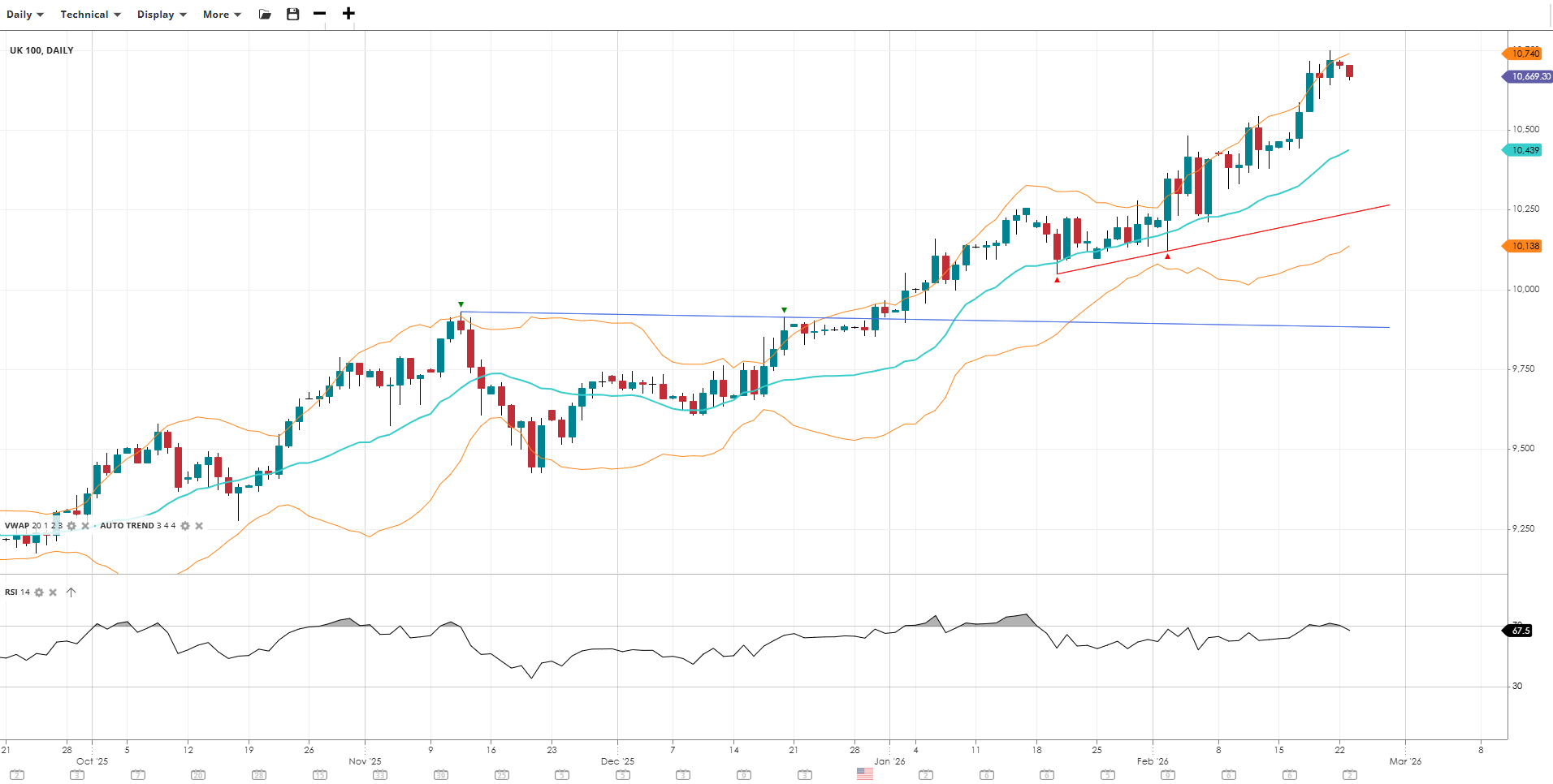 The UK 100 remains the standout performer, continuing its impulsive phase and trading near all-time highs at 10,669. It is well above its VWAP (10,439), and the RSI of 68 indicates strong, persistent buying pressure approaching overbought territory. Resistance is now eyed at 10,740, while support is significantly lower at 10,138, reflecting the strength of the underlying trend.