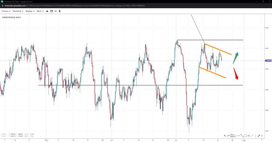 Despite being in a wider medium-term range, EU 50’s short-term structure resembles a bullish flag pending further upside. Taking control of 4420 might see the index tick higher towards the measured-move projection at 4480, while a drop under 4340 might lead it to 4300.