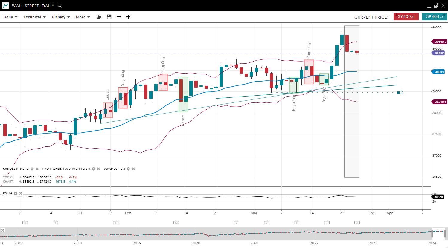 | Wall Street | Bullish | Impulsive | 39402 | 38964 | 38258 | 39669 | 59 |