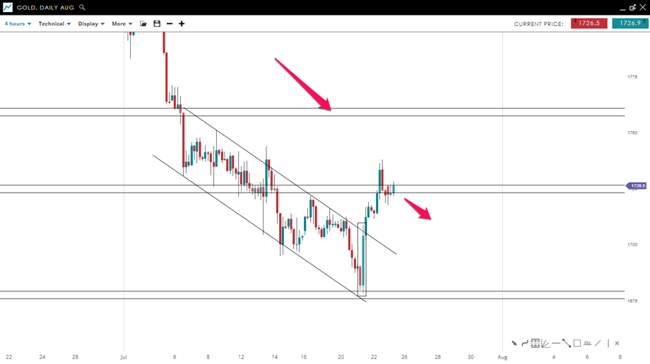 After posting an engulfing bullish pattern the price of Gold broke above the bearish channel  and closed above the pivot level. However, the breakout looks weak since a big bearish bodied bar was posted at this zone, which could lead to a reversal and a move to the downside toward the 1,675 mark. However, if the price stays above the 1,725 mark we could see gold reaching the 1,760 mark.
