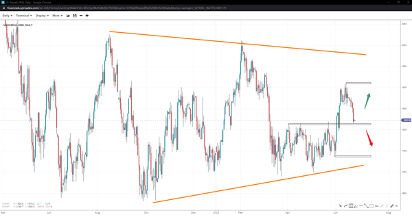 Despite recently breaking past the 1820 range top, 1910 formed a resistance in Russell 2000, increasing the chances of a completed triangle pattern, particularly in the event of further a breakdown towards 1735. If the regional bottom holds firm, prices might accelerate to new monthly highs towards 2k.