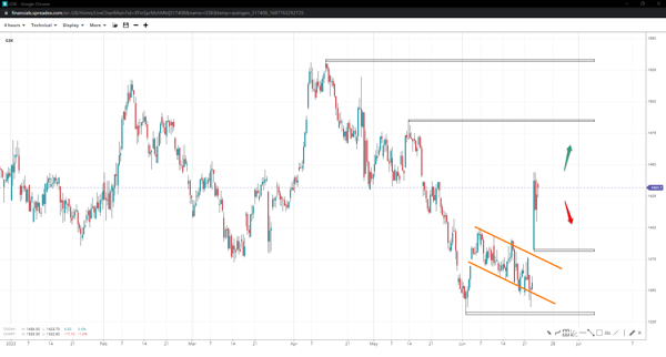 The stock price of GSK left a flag behind, clearing the path towards 1525p following a successful takeover of 1485p. If the gap at 1355p  is fully reversed in the event of a slide under 1380p, the stock will be exposed to the regional low of 1330p.