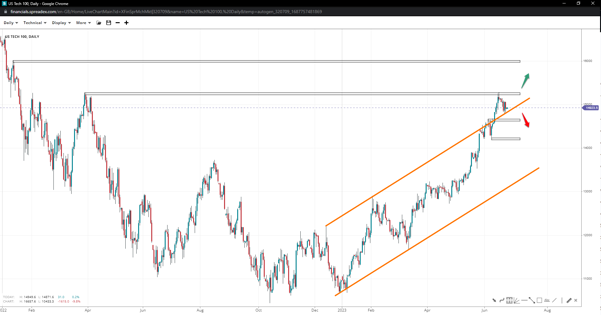 US Tech extended to 15300 and reversed after forming a double top to retest the upper ascending channel as support, remaining in an accelerated trend towards 16k with short-term resistance at 15500. Under 15k, however, the likelihood of further declines towards 14665, and less likely 14230, increases.