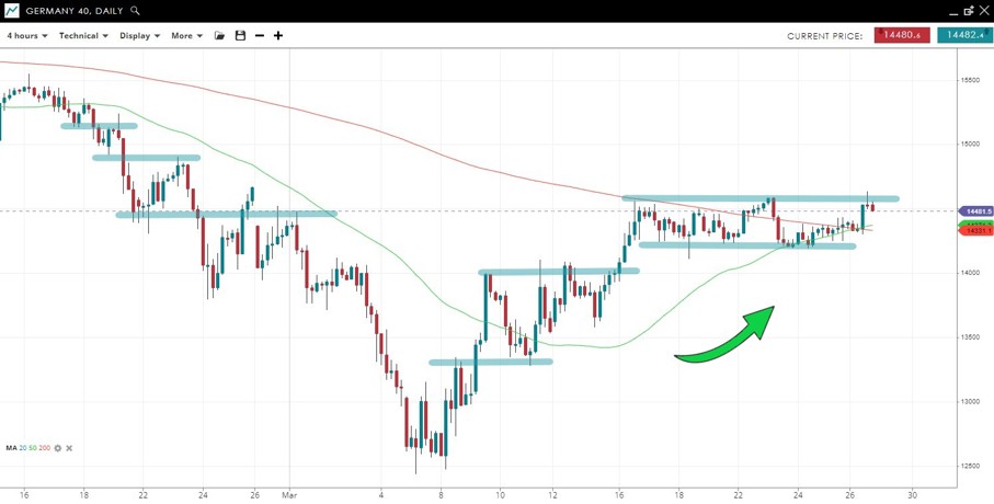 The Germany 40 price broke the 200 SMA but remains under resistance at 14,600. The trend remains up while above the range support at 14,200