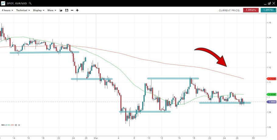 The Brent price made a fakeout move over 120 and has since broken below support at 113, suggesting another test and possible break below the 200 SMA.