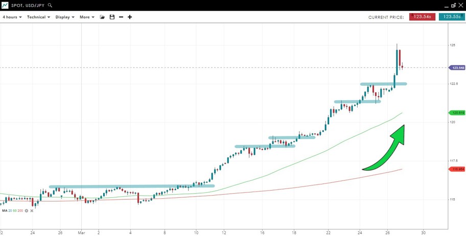 The UK 100 price continues to trend higher above both the 50 and 200 SMAs but is trapped underneath the March 23 at 7520.