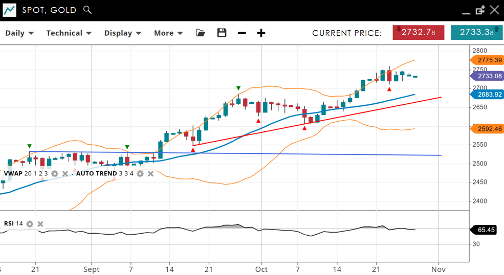 Gold remains very bullish still in an impulsive phase as the price tracks sideways in a narrow range under record highs. The current price is 2,733, above the VWAP (20) of 2,683. Support is found at 2,592, and resistance is at 2,775. The RSI is 65, reflecting strong bullish momentum without being overbought.