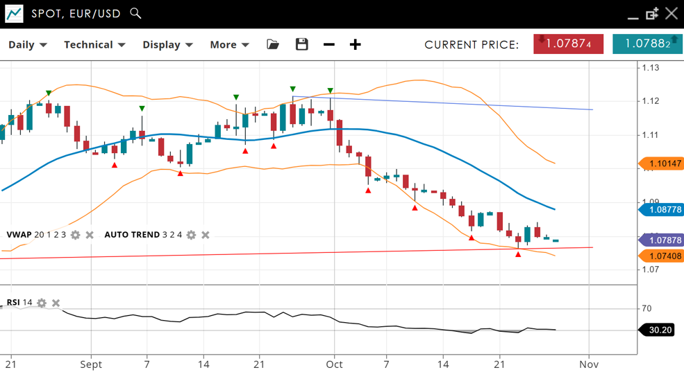 EUR/USD is bearish in an impulsive phase, continuing to show strong downward momentum. The current price is 1.0787, below the VWAP (20) of 1.0877. Support is at 1.0740, with resistance at 1.1014. The RSI is 30, indicating strong bearish momentum and an oversold market.