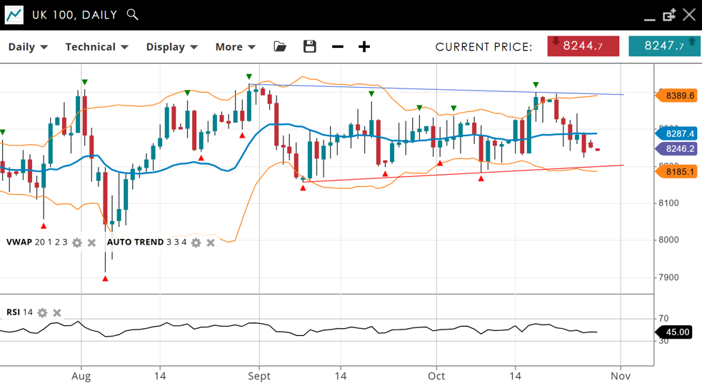 | UK 100 | Neutral | Consolidation | 8246 | 8287 | 8185 | 8389 | 45 |