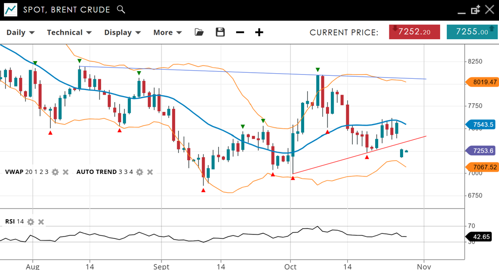 Brent Crude remains neutral in a consolidation phase with no clear directional bias. The short term price trend is negative with the price of 7235, below the VWAP (20) of 7543. Support is located at 7067, with resistance at 8019. The RSI is 42, indicating a lack of clear momentum.