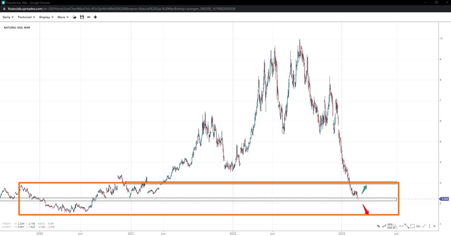 Natural gas decreased to the triple bottom low of 2.25, paving the way towards 1.50. If demand declines at the support, the chances of seeing some respite towards 3.00 will be restricted. If the commodity succumbs lower, there is a risk of further declines towards 2.00